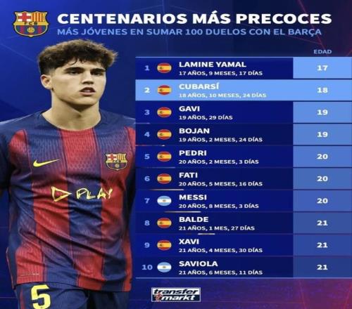 最近德国转会市场列了“巴萨最年轻百场先生”榜单,亚马尔17岁就刷到百场,梅西是20岁多才到百场。可往下看总进球、总助攻,有的人百场来得快,但数据累计并不高;也有人百场没那么早,后面却把进球和助攻拉到历史级。把“百场年龄”和“总场次、总进球、总助攻”放在一起看,差距一下就出来了。