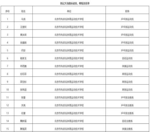 新京报讯 据体育北京官微消息,在第十五届全国运动会,北京体育健儿顽强拼搏、团结协作,圆满完成参赛任务,为首都体育事业再创佳绩。依据《北京市事业单位工作人员奖励实施办法》等文件规定,市人力资源社会保障局会同市体育局对在第十五届全国运动会上作出杰出贡献的北京运动员和教练员,开展记大功奖励工作。根据奖励工作部署,在有关单位积极推荐的基础上,经综合评审、统筹考虑,确定北京乒乓球运动队等9个集体,马龙等28位同志拟记大功对象。